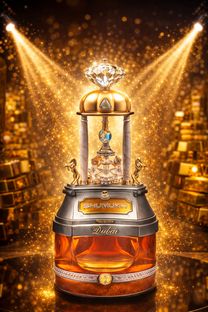Shumukh is a masterpiece of opulence. The bottle is adorned with thousands of diamonds, pearls, topaz, and 18k gold. It is displayed more like a sculpture than a fragrance.